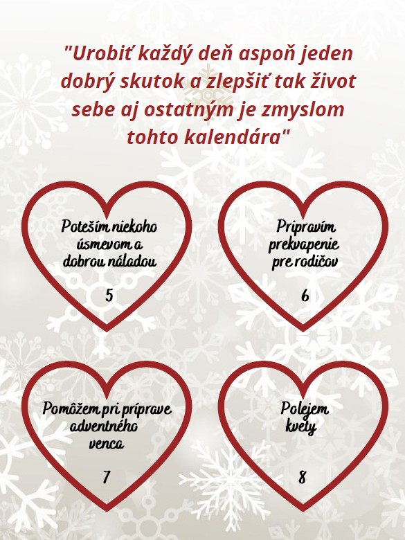 Deti si každý deň ráno „vyžrebovali“ zo svojho kalendára jeden dobrý skutok a „tajne“ ho vykonali. Keď sa im to podarilo, srdiečko vyfarbili a zavesili na náš „špeciálny“ obrovský vianočný stromček urobený z kartónu. Decká si každý deň pod ním rozprávali malé dobrodružstvá o tom, čo zažili pri plnení dobrého skutku, sedávali sme pod ním a rozprávali sa o tom, že keď človek urobí dobrý skutok, tak je rovnako obdarovaný ako ten, pre koho ten skutok vykonal, takže také skutky sú ozajstnými darmi, lebo sú pri nich obdarovaní všetci zúčastnení.
